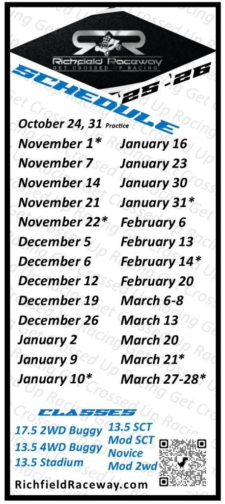 We race Friday Nights starting at 6:30pm throughout the winter until the end of March. Doors open at 1 pm. Practice begins at 3 pm. Often practice starts earlier but 3 pm is officially the start time to ensure enough time to have track setup complete on a Friday. For Saturday races doors open at 8am, Practice is 8-11am, racing begins at 11am.